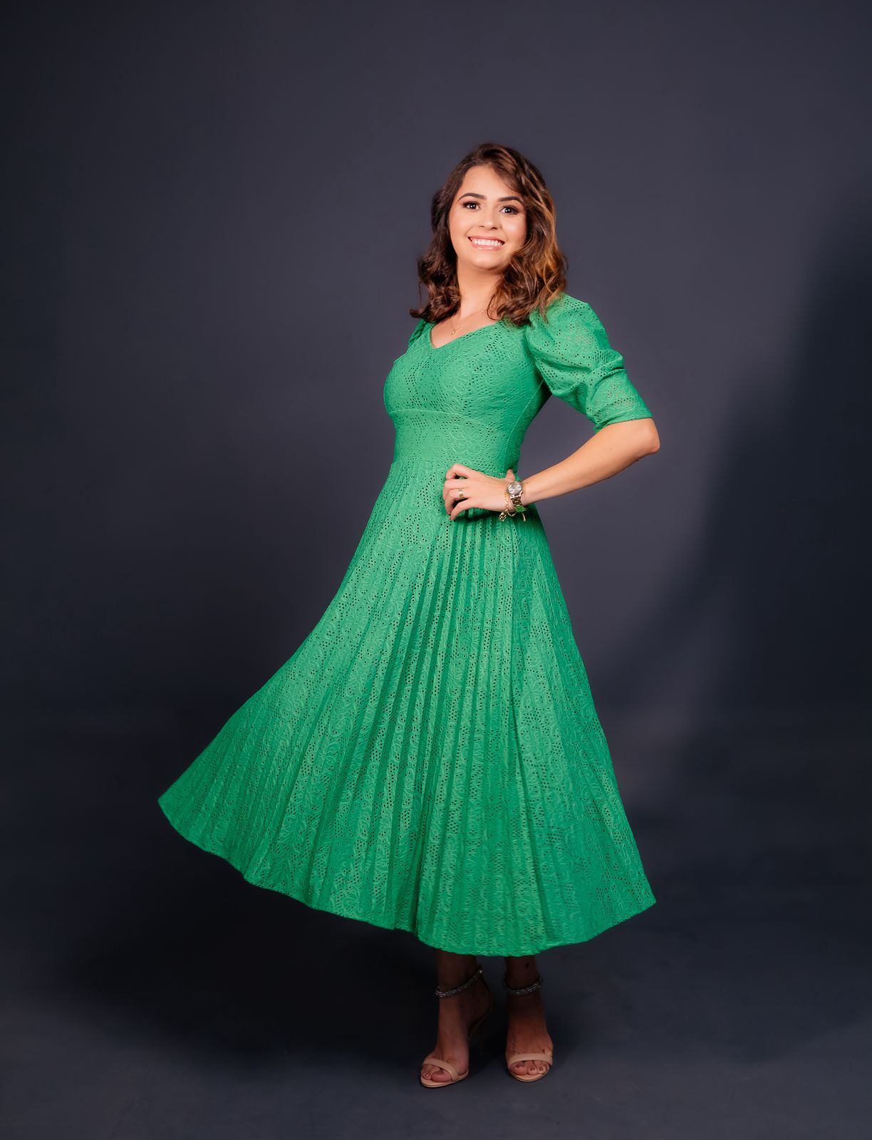 A saia plissada proporciona movimento suave e um charme atemporal, criando um visual leve e sofisticado. Totalmente forrado, o vestido oferece segurança, ótimo caimento e acabamento impecável.