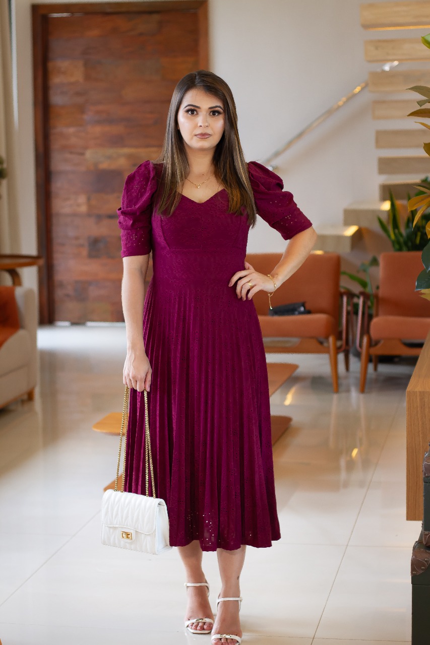 A saia plissada proporciona movimento suave e um charme atemporal, criando um visual leve e sofisticado. Totalmente forrado, o vestido oferece segurança, ótimo caimento e acabamento impecável.
